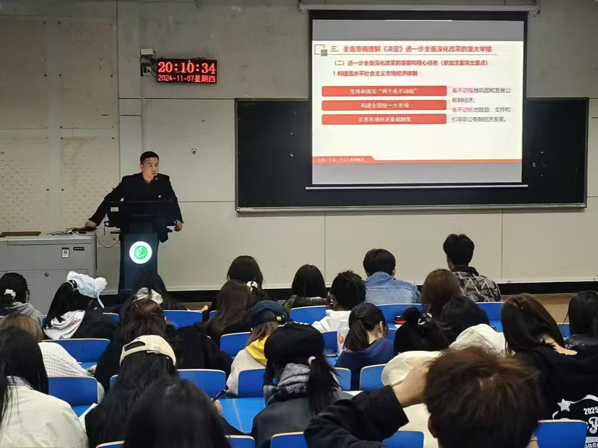 马克思主义学院王志浩博士以《新征程上进一步全面深化改革的行动纲领》为题,围绕党的二十届三中全会提出的重大战略、重大部署、重大论断作了系统阐释和权威解读,帮助学员更好地理解和把握全会精神的核心要义和实践要求。