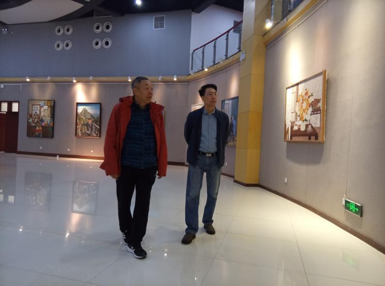 肖红来到艺术楼美术展览,参观了学生的油画、国画作品展,对参展作品的创意与水准给予肯定,并针对作品的艺术表达、实用价值提出优化建议。