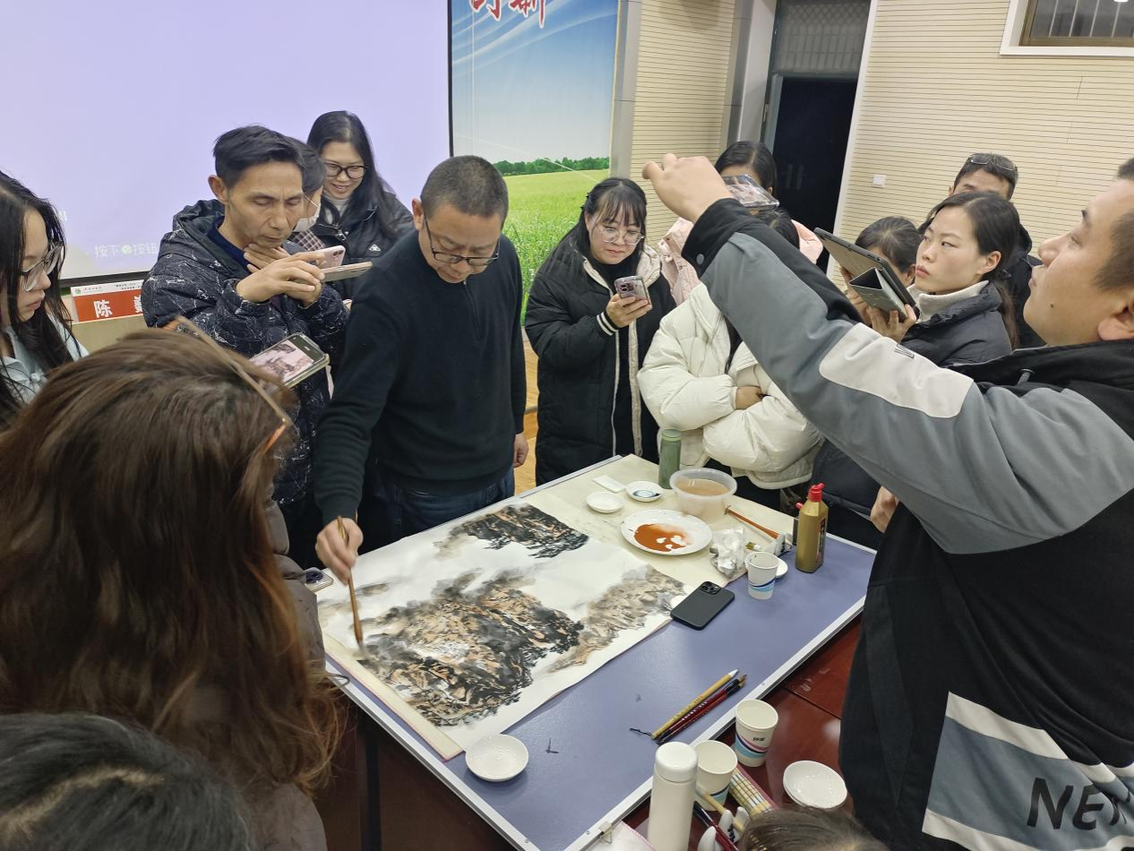 本次技法研修课程中,陈巍教授首先立足山水画发展脉络,从隋唐《游春图》中山水元素的雏形初现,到两宋、元代山水画的艺术高峰,系统梳理了树法、石法在传统山水画中的演变历程,让参训教师对技法源流形成宏观认知。随后,他将复杂的山水技法拆解为两大核心模块,进行精细化讲解,让学员明晰不同技法的适用场景与表现效果。课程尾声,他亲自挥毫示范,将理论知识转化为直观的创作实践。笔墨在宣纸上流转间,浓淡干湿的墨色变化、疏密转折的线条排布,让苍劲挺拔的树木、棱角分明的山石跃然纸上,生动诠释了传统山水画的笔墨魅力,也让参训教师们对技法要点有了更深刻的理解。现场教师专注记录、细心观摩,将理论讲解与示范细节转化为自身的专业积累。
