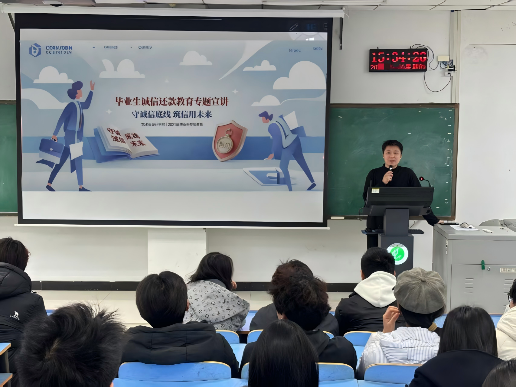 辅导员宋坤宇以诚信教育为切入点,结合多年高校学生管理实践,引导毕业生树立理性消费理念与良好信用意识。他强调,助学贷款承载着国家对青年学子的关怀与期许,按时履约还款既是践行契约精神的基本要求,更是新时代大学生诚信素养的直观彰显。他呼吁同学们珍视这份政策帮扶,将诚信内化于心、外化于行,以坚守信用的实际行动,不负国家培育与社会关爱。